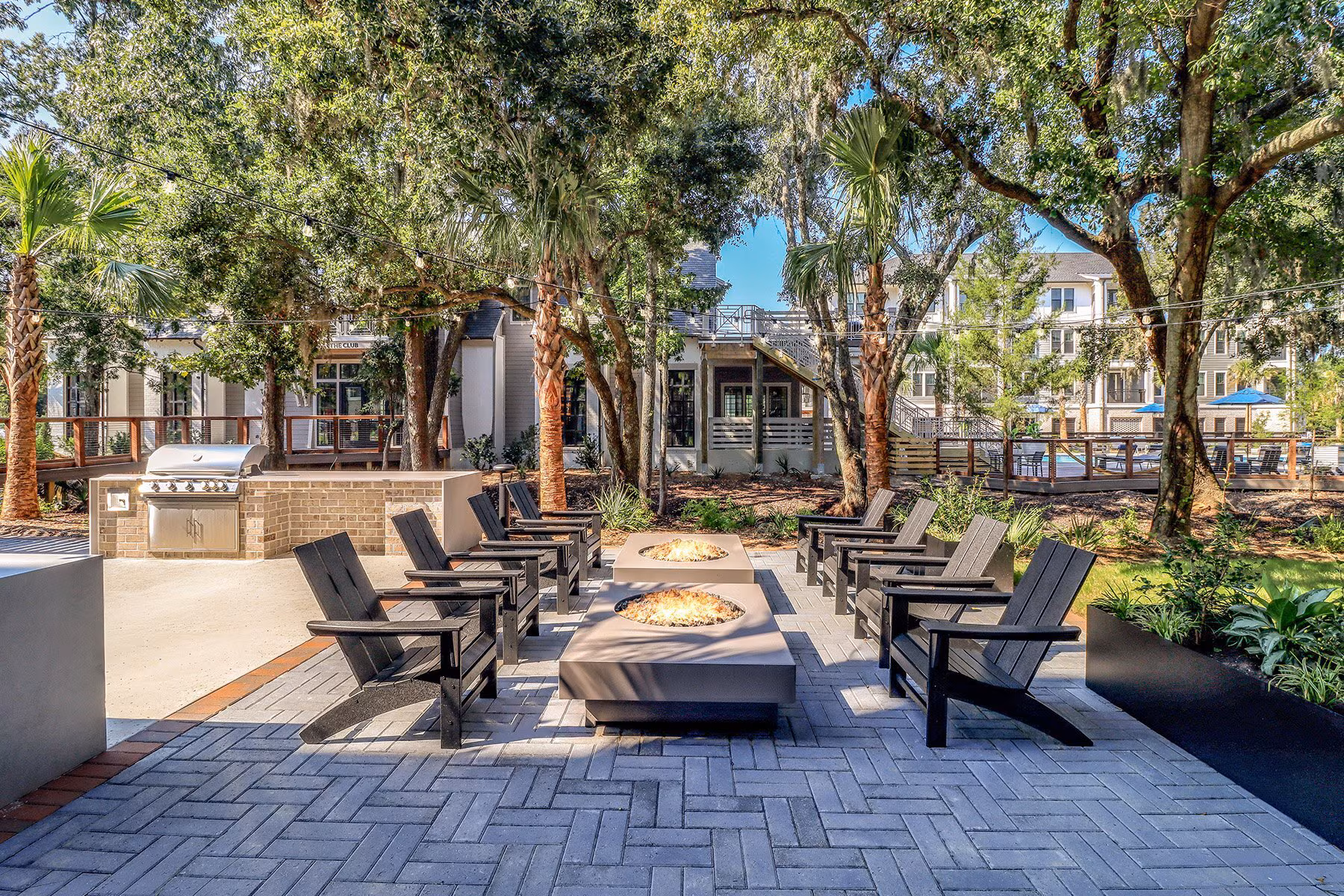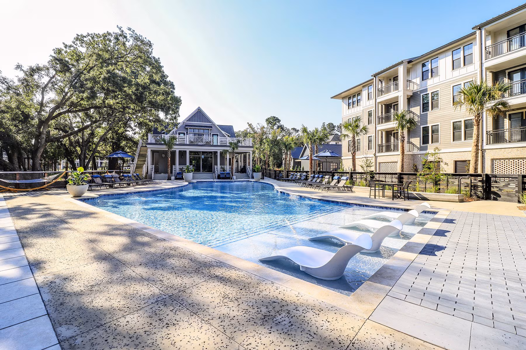 Envisioned as an upland manor infused with low-country materiality, The Henslow combines refined architecture and inviting outdoor spaces to reflect the luxurious lifestyle of the Daniel Island community. Centered around a grand clubhouse featuring a southern stair hall, modern fitness center, and club room that opens onto a rooftop terrace overlooking the pool and gardens, the design promotes both elegance and connection. Complementing these spaces are a serene business center, a freestanding yoga and activity barn with full beverage support, and all-season outdoor lawns, with bike facilities and nature paths completing the amenity experience.